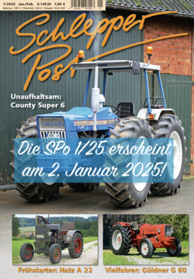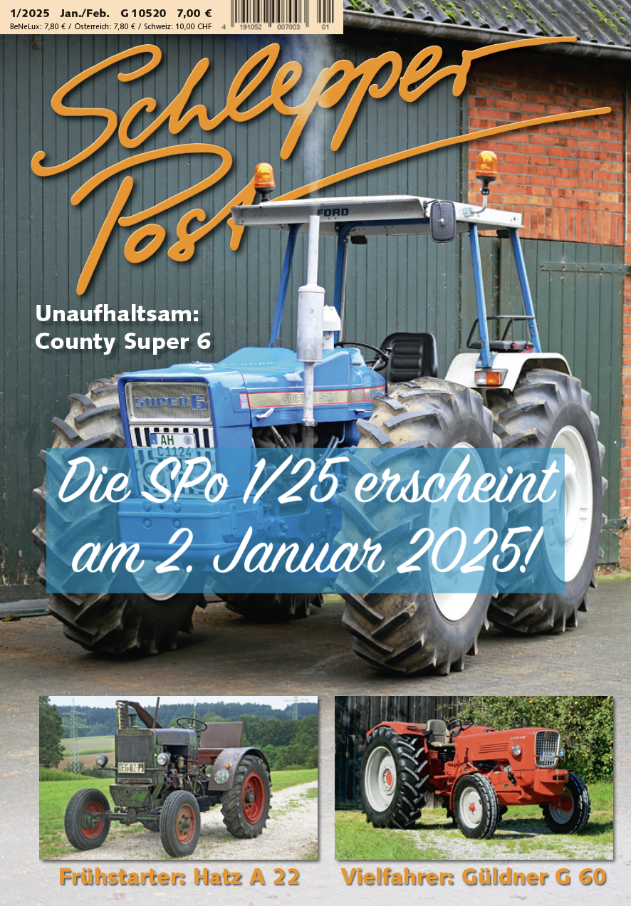 Die Januar-Februar-Ausgabe der Schlepper Post ist ab Donnerstag, 2. Januar 2025 im Zeitschriftenhandel zu haben. Abonnenten bekommen das Heft schon einige Tage eher ins Haus geschickt. Mehr Infos zum Abo? - Bittesehr, hier gibt es die Infos!